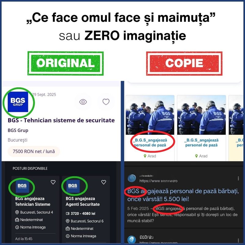 Platformele online de recrutare și anunțuri au preluat abuziv elemente din identitatea noastră. De exemplu, pe unele site-uri de joburi au apărut anunțuri false de angajare, care afișau denumirea și datele companiei noastre, deși nu aveau nicio legătură cu BGS. În momentul în care încercai să aplici pentru un post - de tip branch manager, de pildă - anunțul era gol, iar aplicarea imposibilă. Practic, imaginea și marca noastră erau folosite pentru a atrage atenția, fără ca în spate să existe un proces real de recrutare. Am documentat aceste situații, inclusiv prin capturi video, și am sesizat autoritățile competente, având în vedere că astfel de practici pot fi încadrate și ca publicitate înșelătoare. De asemenea, pe alte platforme de anunțuri au apărut oferte de angajare în numele nostru, care redirecționau spre alte firme sau entități fără legătură cu BGS.